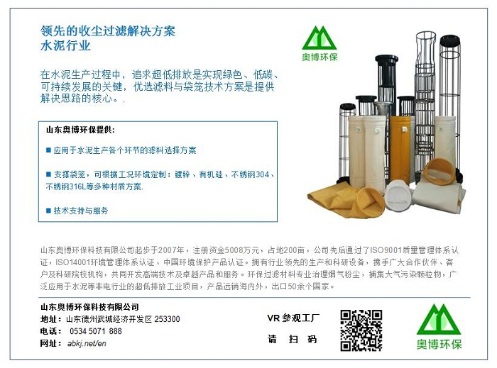 文章詳細(xì)分享了超低排放背景下,在水泥行業(yè)的各個(gè)生產(chǎn)環(huán)節(jié)(窯頭、窯尾、水泥磨、煤磨等)的煙氣收塵特性,針對(duì)性的提出濾料與袋籠的選用技術(shù)。并提出了納米濾料表面處理技術(shù)的發(fā)展趨勢(shì)。山東奧博環(huán)保一直走在濾袋和袋籠發(fā)展的最前沿,不僅關(guān)注當(dāng)下水泥行業(yè)的最新動(dòng)態(tài),更著眼于幫助水泥等工業(yè)解決未來可能遇到的種種挑戰(zhàn),相信在國內(nèi)外水泥行業(yè)的收塵過濾技術(shù)方面會(huì)有更大的提升。