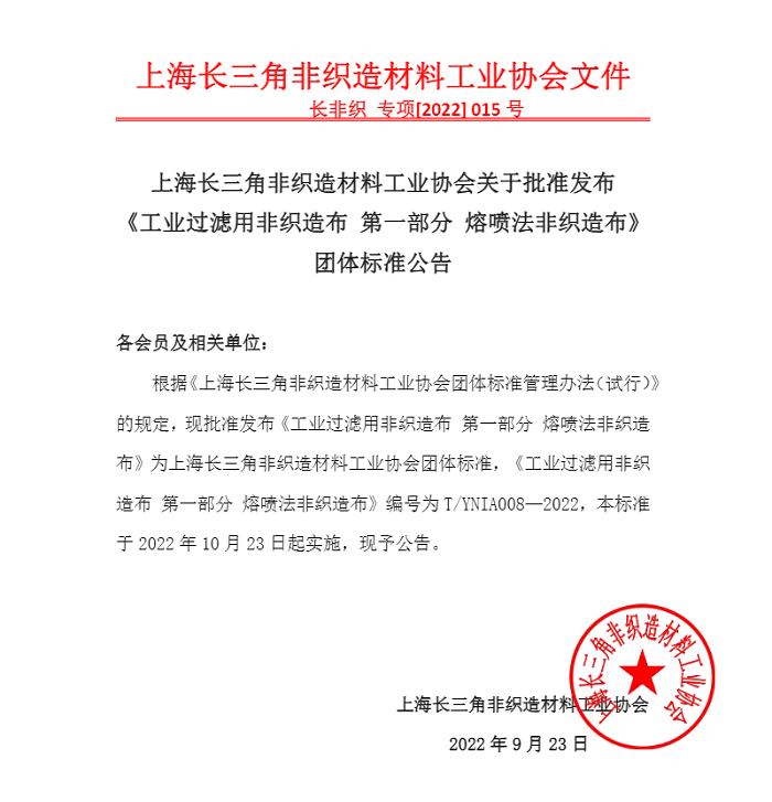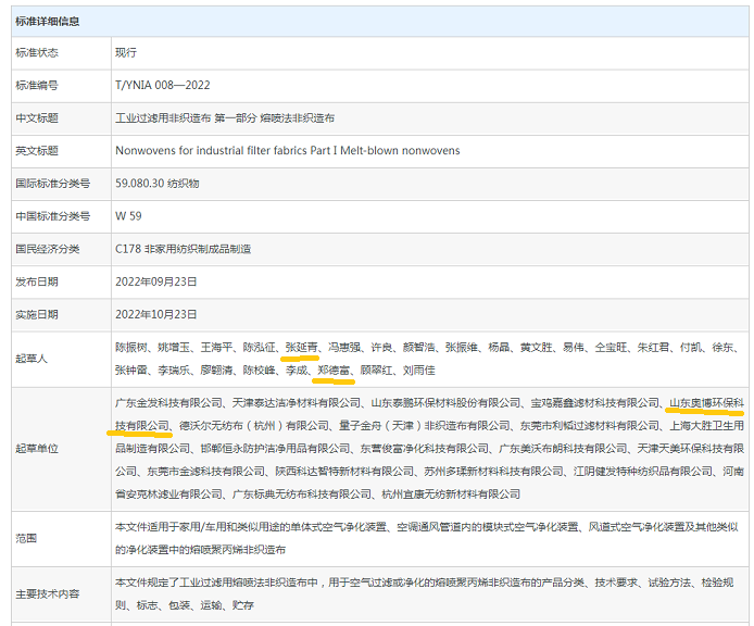 2022年9月23日,山東奧博環(huán)??萍加邢薰緟⑴c編制的 T/TNIA 008-2022《工業(yè)過濾用非織造布 第一部分 熔噴法非織造布》由上海長三角非織造材料工業(yè)協(xié)會(huì)權(quán)威發(fā)布,并于2022年10月23日起實(shí)施。