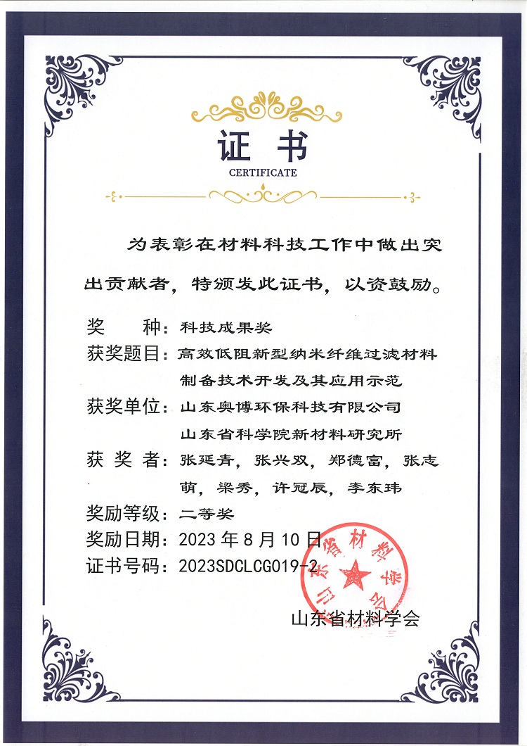 大會(huì)舉行的山東省材料科技成果頒獎(jiǎng)儀式,由山東奧博環(huán)保科技有限公司與山東省科學(xué)院新材料研究所,共同研發(fā)的“高效低阻新型納米纖維過濾材料制備技術(shù)開發(fā)及其應(yīng)用示范”項(xiàng)目,以其優(yōu)秀的產(chǎn)品性能,廣泛的應(yīng)用領(lǐng)域及社會(huì)經(jīng)濟(jì)效益,榮獲二等獎(jiǎng)!