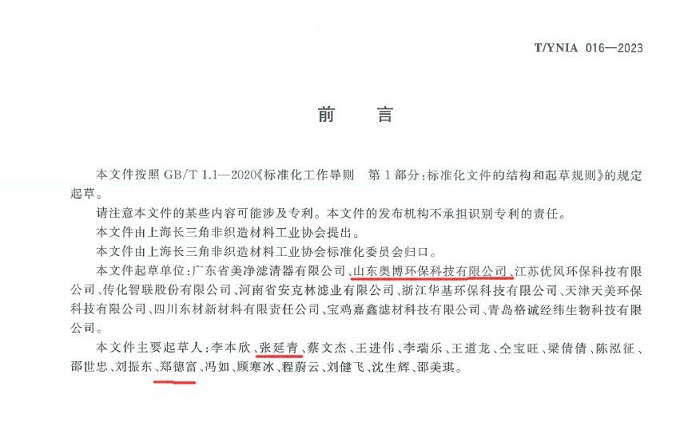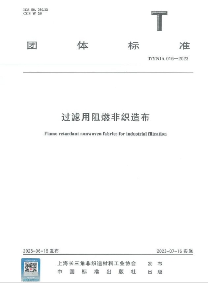 T/YNIA016-2023《過濾用阻燃非制造布》由上海長三角非織造材料工業(yè)協(xié)會權威發(fā)布,山東奧博環(huán)??萍加邢薰緸橹饕瓿蓡挝?/span>