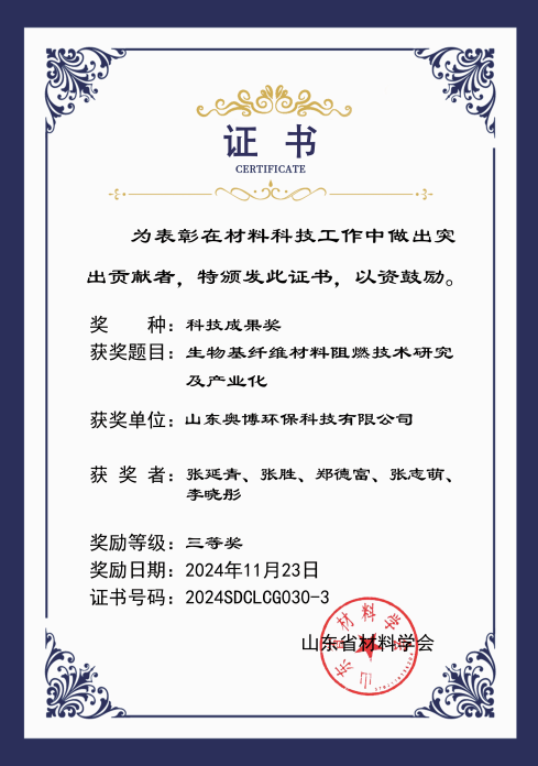 山東奧博環(huán)保的科研課題《生物基纖維材料阻燃技術(shù)研究及產(chǎn)業(yè)化》,榮獲此次山東省科技成果三等獎!