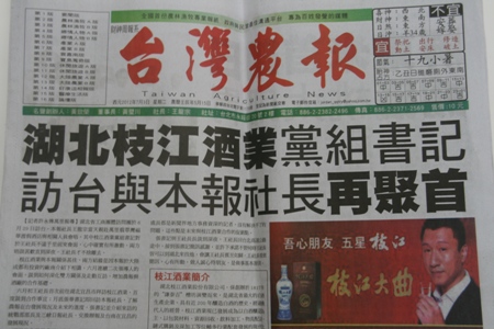 6月15日,《臺灣農(nóng)報》2版頭條刊發(fā)了臺灣農(nóng)報社長王龍宗、副社長許永傳一行來宜昌考察的新聞及在枝江酒業(yè)釀造五車間拍攝的大型圖片。圖片中蒸…