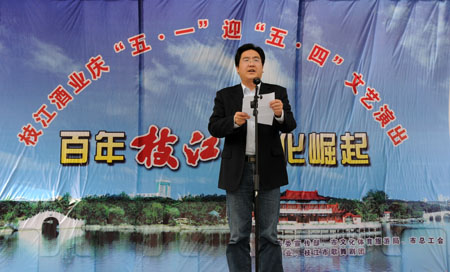 4月23日,枝江酒業(yè)集團(tuán)玖源包裝有限公司總經(jīng)理劉鳳春在公司門口為獲得2009年度生產(chǎn)標(biāo)兵的10名優(yōu)秀員工舉行歡送儀式,獎勵(lì)他們赴三峽旅游。 …
