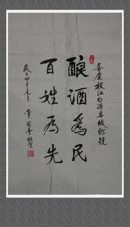 3月17日,枝江酒業(yè)宣傳部收到曾在枝江任職的老縣長(zhǎng)李國(guó)普寄來(lái)的書法作品,“釀酒為民,百姓為先”、“緊盯老字號(hào),客人滿天下”。蒼勁有力的書法,飽含了老一輩枝江政界領(lǐng)導(dǎo)對(duì)枝江酒業(yè)的牽掛和關(guān)懷。李國(guó)普老人1932年生,原任枝江縣人民政府縣長(zhǎng),后任宜昌市人大副主任。1998年退休,現(xiàn)居宜昌,在書畫、詩(shī)詞、奇石方面均有很深的造詣。他得知枝江市獲得中國(guó)白酒名城稱號(hào),內(nèi)心充滿了喜悅與自豪,揮毫寫下對(duì)中華老字號(hào)枝江酒業(yè)的深情祝福。與老縣長(zhǎng)的書法作品同一天收到的還有湖南株洲市的黎福清老人寄來(lái)的書法作品,“枝江報(bào)苑秀,荊楚美酒香”。黎福清老人是華夏收藏家協(xié)會(huì)的會(huì)員,出版有《收藏百花》,關(guān)注枝江多年,既是枝江酒的消費(fèi)者,也是枝江酒文化的研究者,對(duì)枝江酒業(yè)充滿了深厚的感情。