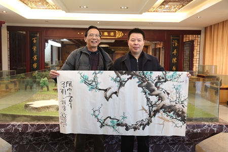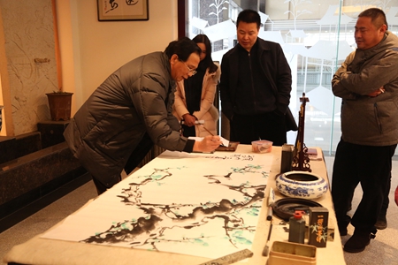 1月28日,國(guó)家一級(jí)美術(shù)師彭宗明到枝江酒業(yè)采風(fēng)。在枝江酒業(yè)銷(xiāo)售總經(jīng)理侯先圣的陪同下參觀了歷史文化展廳、釀造五車(chē)間、包裝三車(chē)間,對(duì)枝江酒業(yè)的歷史文化和獨(dú)特的釀造技藝表現(xiàn)出濃厚的興趣。在枝江酒業(yè)展廳,彭宗明現(xiàn)場(chǎng)揮毫潑墨,即興創(chuàng)作了“風(fēng)雨兩百年,柔雅一枝香”、“百年枝江,香滿乾坤”兩幅畫(huà)作。